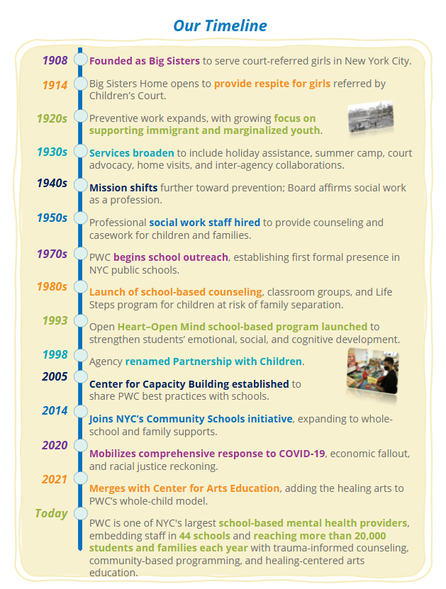 Throughout the 20th century, the organization continually adapted to meet the evolving needs of New York City’s children and families. The work expanded from volunteer mentoring into professional social work, counseling, and family support. By the 1970s, PWC was serving primarily young people impacted by poverty and systemic inequities, and began embedding staff directly in schools. In the 1990s, it launched school-based mental health programs that addressed the profound link between trauma and learning, and in 1998 adopted the name Partnership with Children to reflect its broader mission.